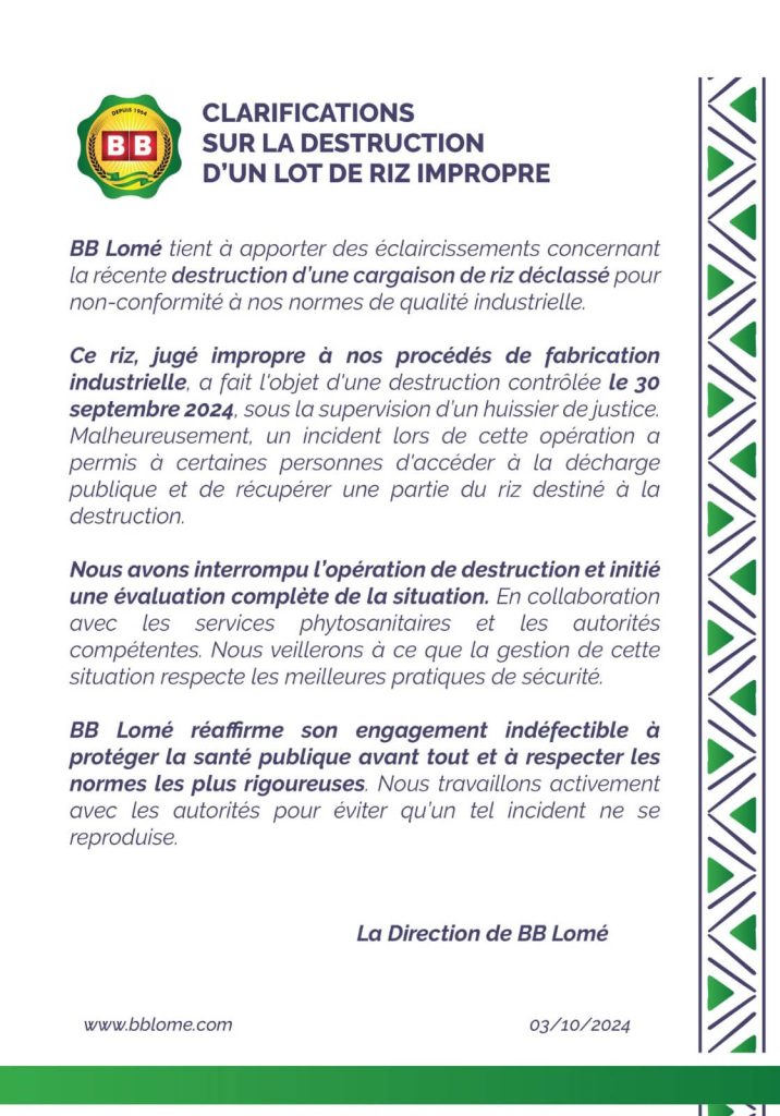 BB Lomé tient à apporter des éclaircissements concernant la récente destruction d’une cargaison de riz déclassé pour non-conformité a nos normes de qualite industrielle.