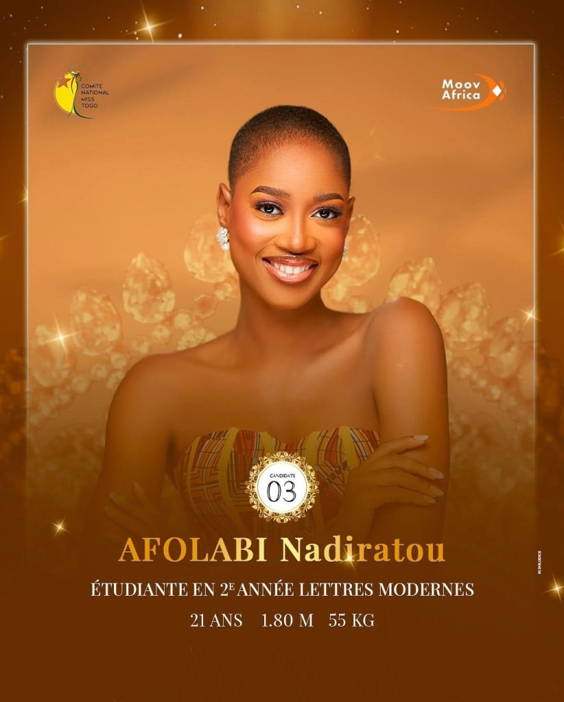Félicitations à Afolabi Nadiratou pour son couronnement en tant que Miss Togo 2025! 👑✨ C’est une victoire bien méritée. Elle a su captiver le public avec sa grâce, son intelligence et son engagement envers la promotion de la culture togolaise. Vous pouvez suivre son parcours et ses projets futurs sur TikTok.